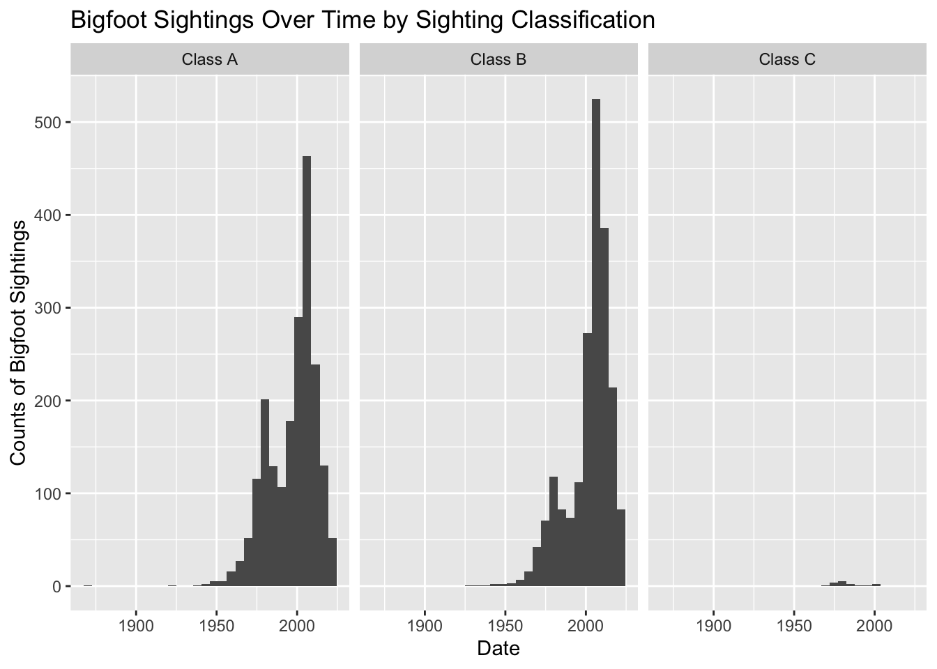 Finally see have Bigfoot sightings over time split up by classification. Class A sightings are where the sightings are clear and where it’s difficult to mistake Bigfoot for another animal. Class B sightings are sightings that occur from a distance and did not offer a clear view, but are still confidently Bigfoot. Class C sightings are second-hand and third-hand reports of Bigfoot and may be inaccurate. We see that Most sightings are Class A and B.